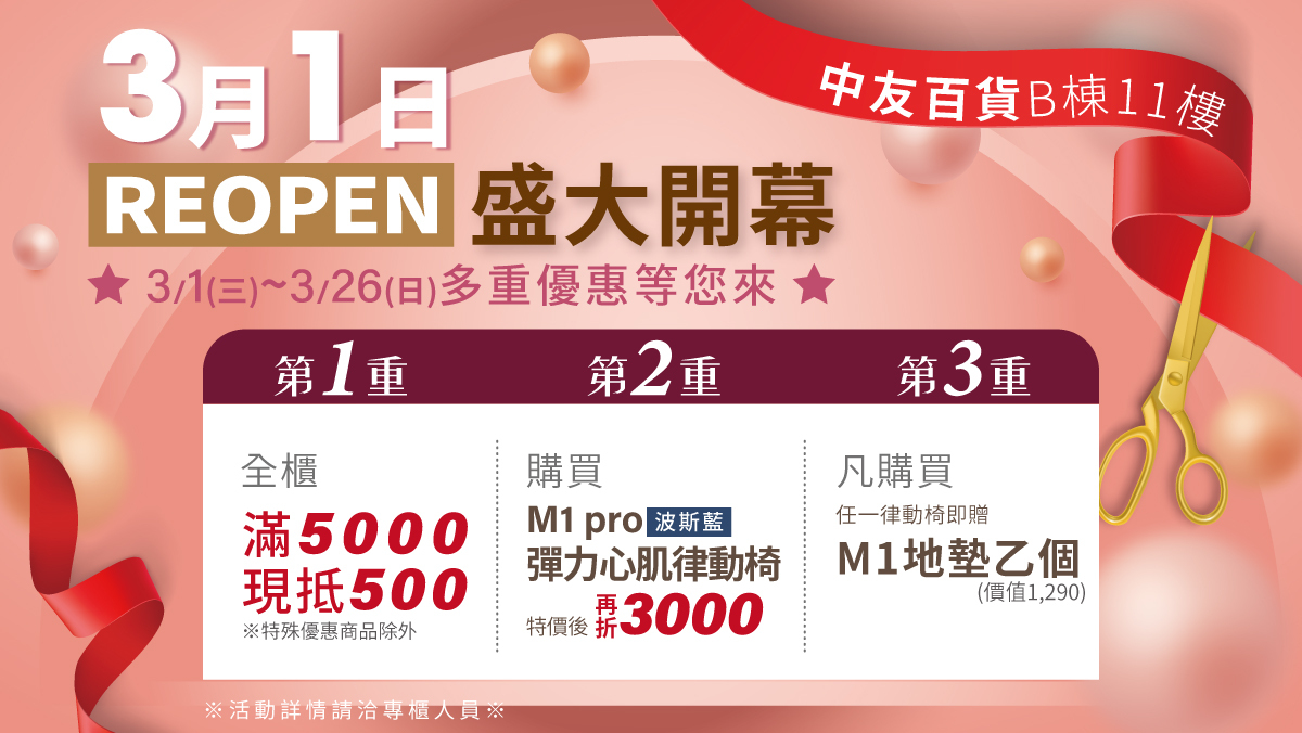 開幕期間,凡購買指定商品,粉絲團按讚打卡、PO體驗文,可享購物金1000元(可現抵),來店體驗15分鐘,再贈隨行瓶一個!